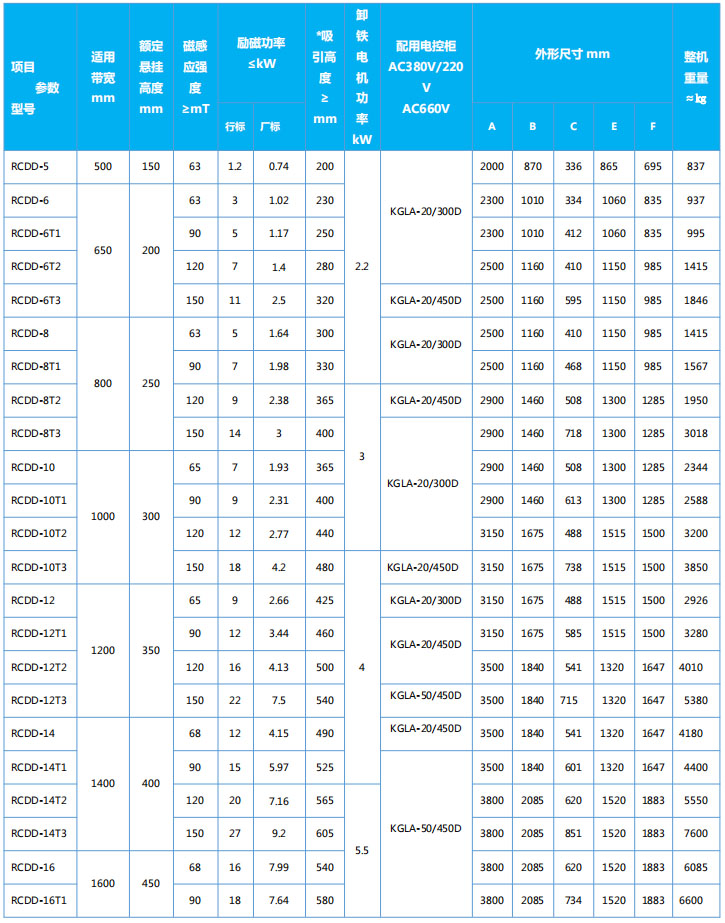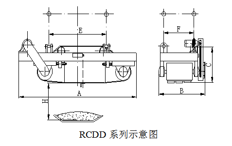 四、RCDD系列懸掛帶式自冷電磁除鐵器主要技術(shù)參數(shù)、外形尺寸 執(zhí)行標(biāo)準(zhǔn):JB/T7689