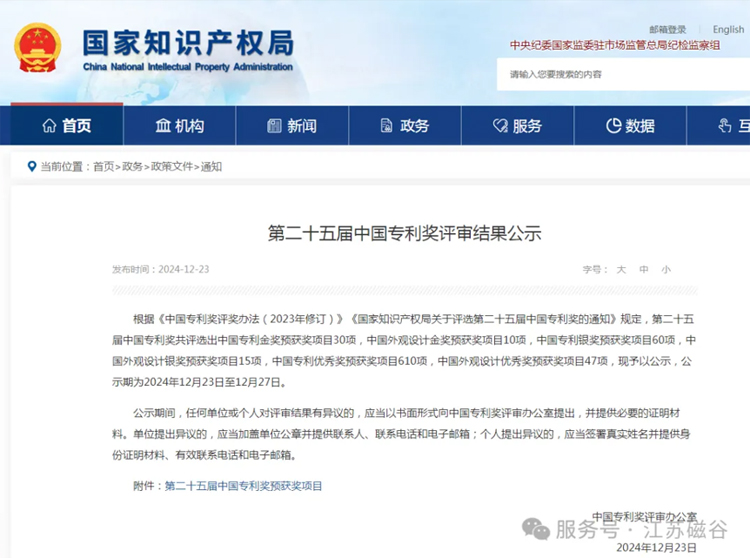 | 喜迎元旦,江蘇磁谷再創(chuàng)佳績——繞組式無刷耦合傳動(dòng)裝置榮獲中國專利獎(jiǎng)優(yōu)秀獎(jiǎng) | ||